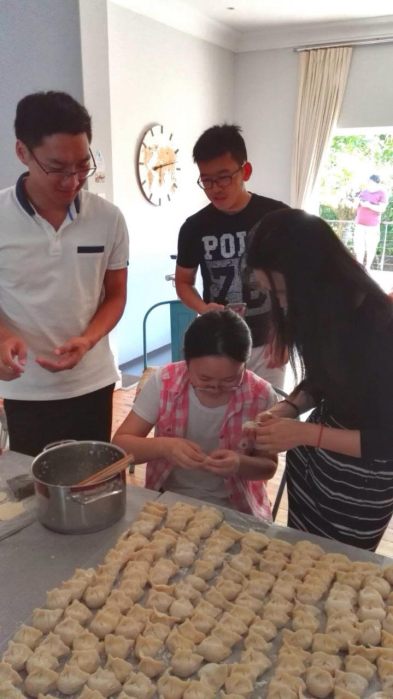 Last night me and my friends made dumplings. All the Confucius Institute teachers who live together were at our friend Tian’s house last night. There were six of us, and seven relatives from our friend Eric’s family [who flew down from China for the holiday] – about 15 people all together.