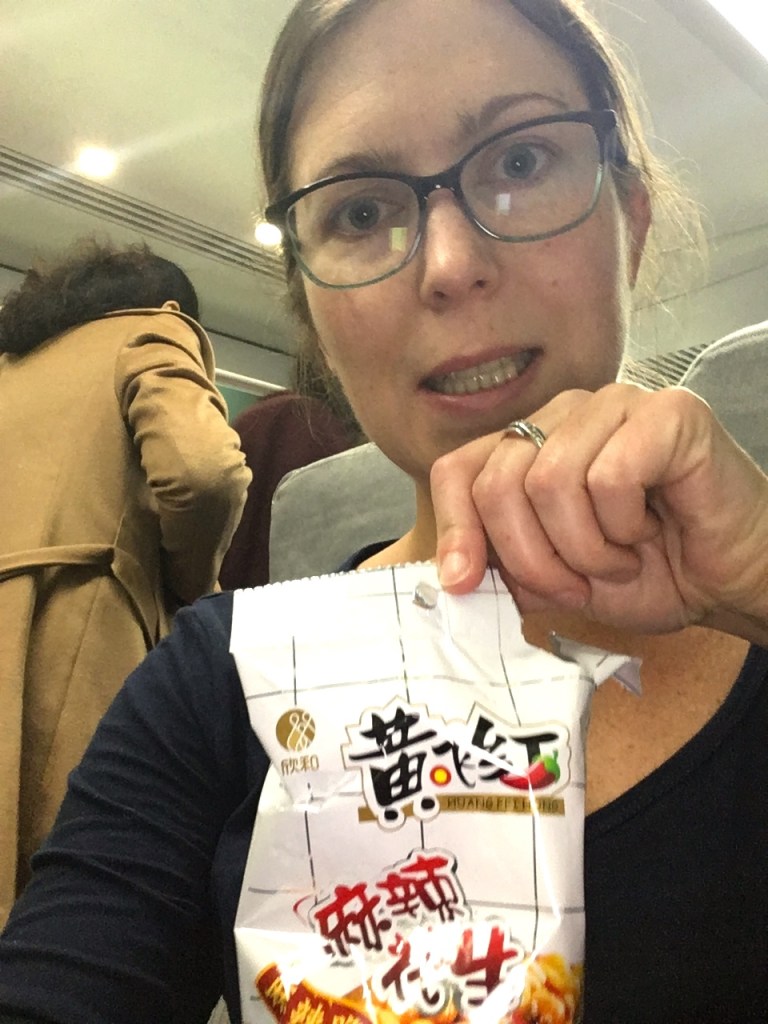Beer number three. I’m pleasantly surprised that he can drink. And, even better, he produces a large foil-lined bag of mala huasheng, the spicy, Sichuan-pepper-numbing peanuts that I love so much the first thing I did when I landed was buy a bag, so I could eat them on my subway into the city. Pinches of dried chilli and black peppercorns combine with the nuts in my fingers and swirl through my bloodstream with the room temperature train-beer. The hum of Mandarin is finding its way back into my throat, and I’m drunk on the randomness of this seethingly beautiful world. As we glide southwards, I’m floating in a space that is comfortingly familiar and yet so removed from the everyday that has become my life since returning to South Africa from China a little more than five years ago. I drink in the buzz with glee.